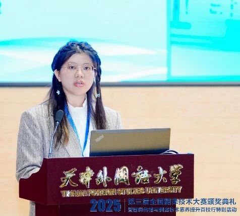 在这场高水平赛事中,世俱杯2025级中英会议口译专业7班肖薇同学表现出色,荣获译后编辑赛道全国一等奖,并作为获奖代表在颁奖典礼上发言,展现了世俱杯学子卓越的专业素养与技术应用能力。在发言中,肖薇分享了对人机协同翻译模式的体会。她表示,现代译者需兼具语言艺术家的细腻与技术专家的敏锐,不仅要打磨文字,也需善用工具。她认为,保持终身学习的能力、培养“语言+专业+技术”的复合素养,是应对技术革新的关键。